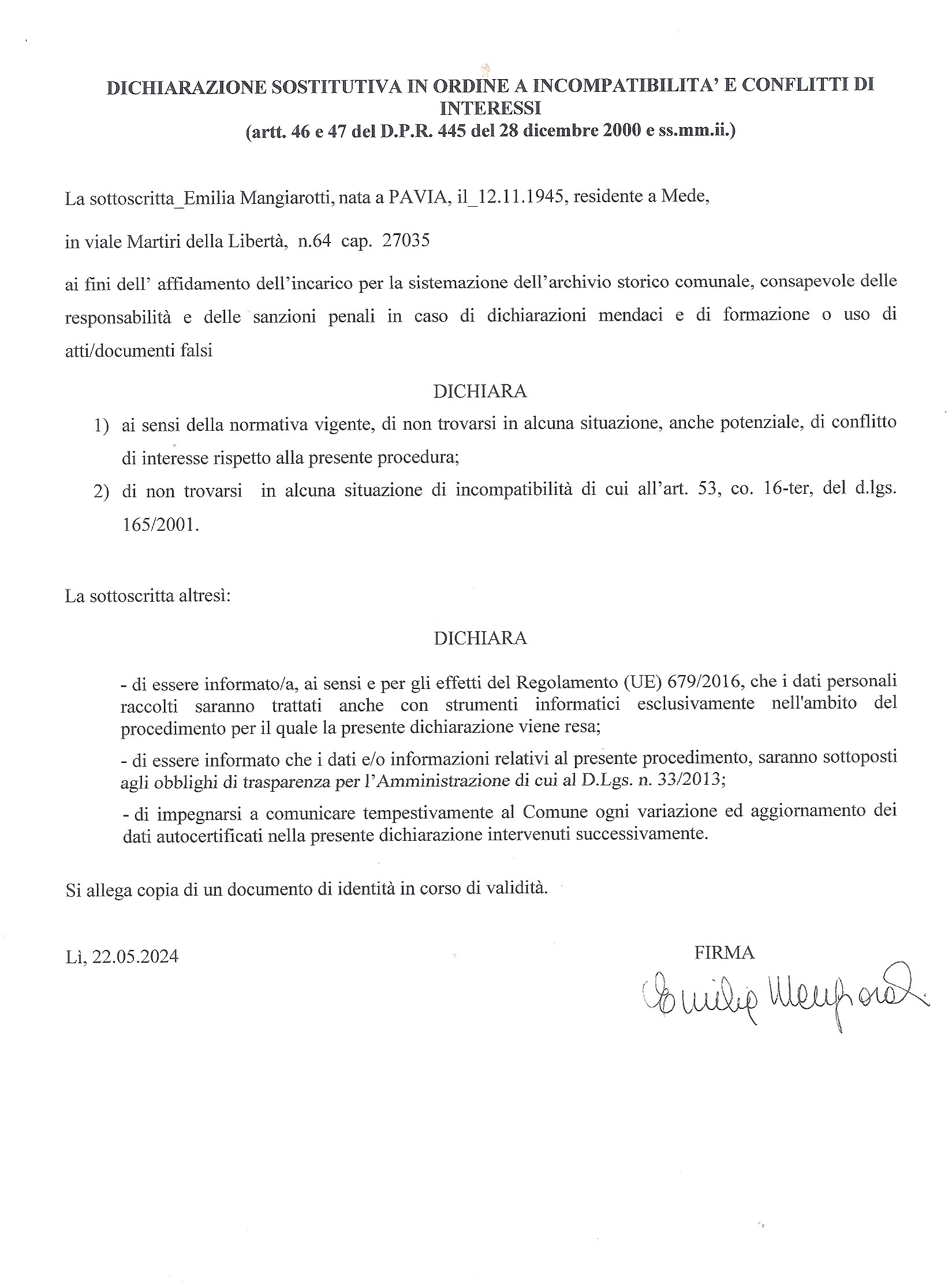 | Ragione dell'incarico | Conferimento incarico archivista per sistemazione archivio storico comunale 2024 |