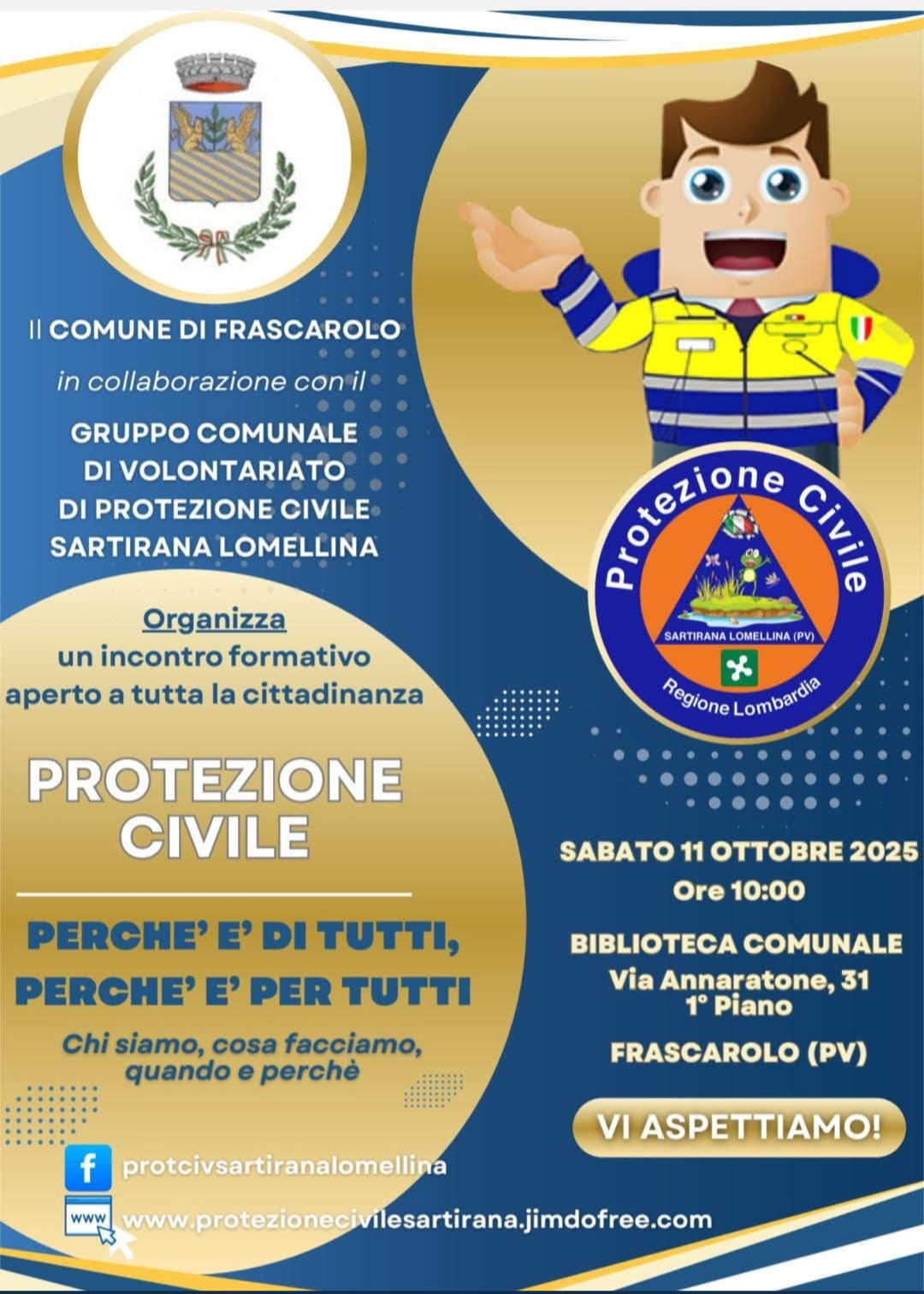 Il Comune di Frascarolo insieme con il gruppo Comunale di Volontariato di Protezione Civile Sartirana Lomellona organizza un incontro formativo aperto alla popolazione del Comune di Frascarolo presso la Biblioteca Comunale Via a. annaratone n.31 primo piano.