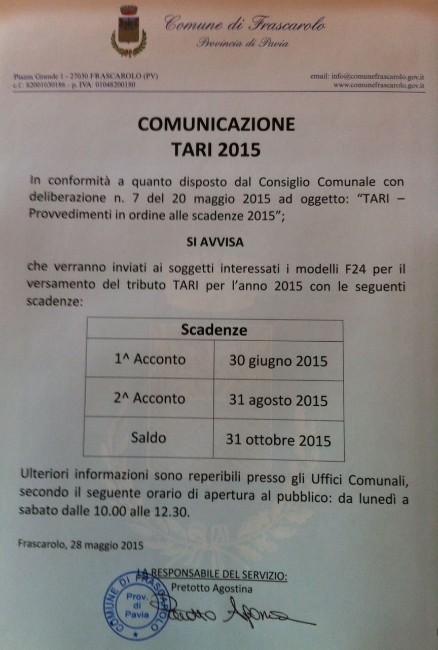 In conformità a quanto disposto dal Consiglio Comunale con deliberazione n. 7 del 20 maggio 2015 ad oggetto: “TARI – Provvedimenti in ordine alle scadenze 2015”;