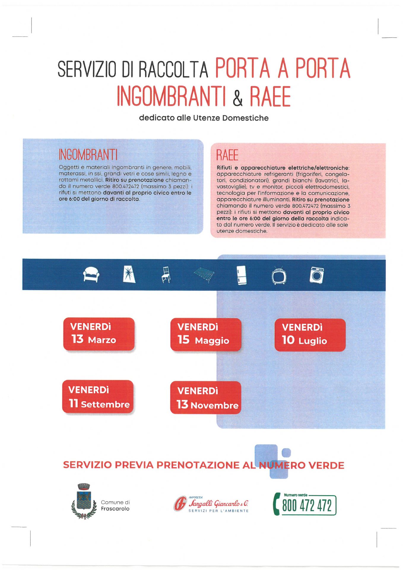 Servizio di raccolta Porta a Porta Ingombranti & Raee Dedicato alle utenze domestiche Servizio Prenotazione al numero verde 800472472